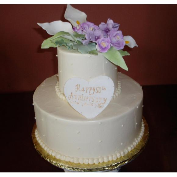 We offer our anniversary cakes in a variety of sizes to best suit your needs. Our cakes are round and typically come in 6", 8", or 10" sizes and all cakes are made to order. For our anniversary cakes we take whichever theme, color, or idea you would like and transform it into something as beautiful as the love you're celebrating!