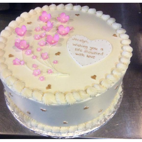 We offer our engagement and bridal shower cakes in a variety of sizes to best suit your needs. Our cakes are round and typically come in 6", 8", or 10" sizes and all cakes are made to order. For our engagement and bridal shower cakes we take whichever theme, color, or idea you would like and transform it into something as beautiful as the love you're celebrating!